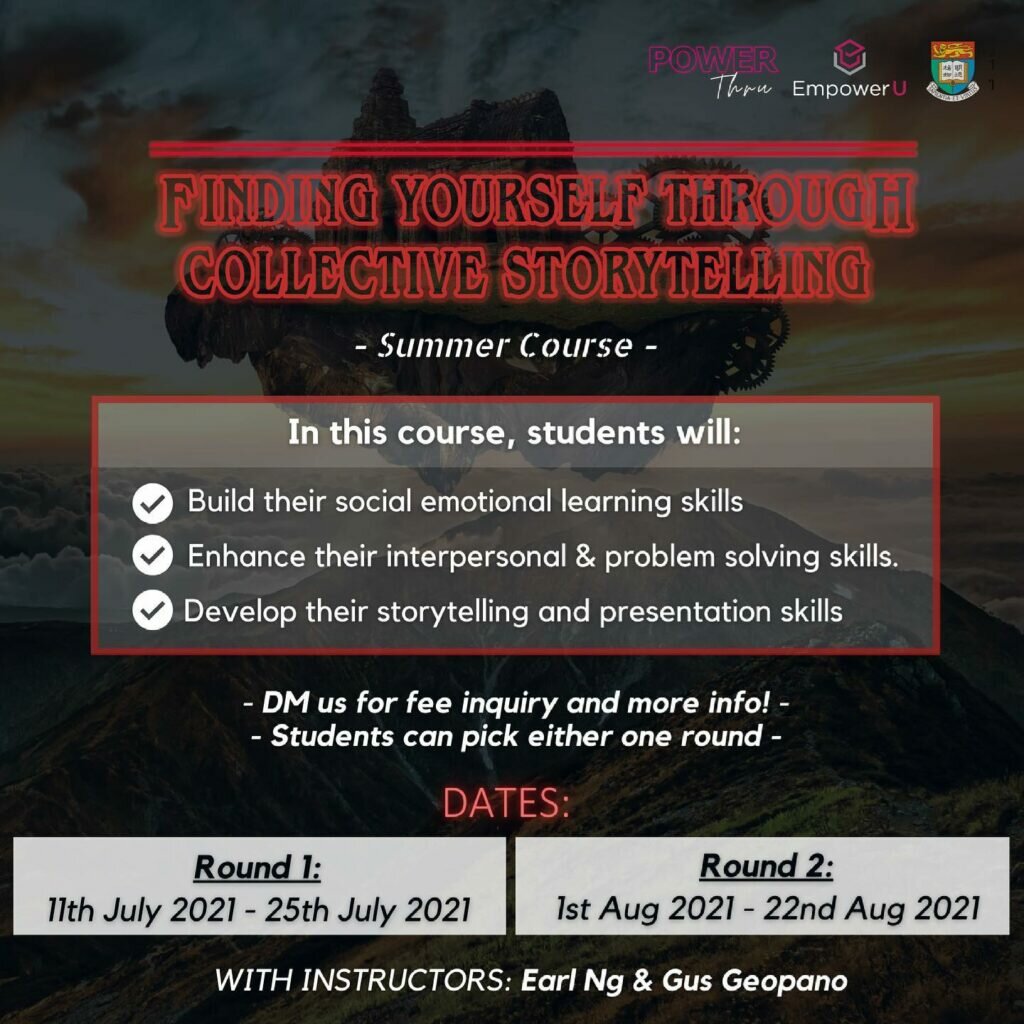 The PowerThru Summer Education Program is targeted at creating exciting and innovative learning opportunities for ethnically diverse Hong Kong students. If you are a Hong Konger in Secondary 3-5 and interested in joining our course, “Finding Yourself Through Collective Storytelling“, follow this link to learn more and sign up for our courses in July or August.